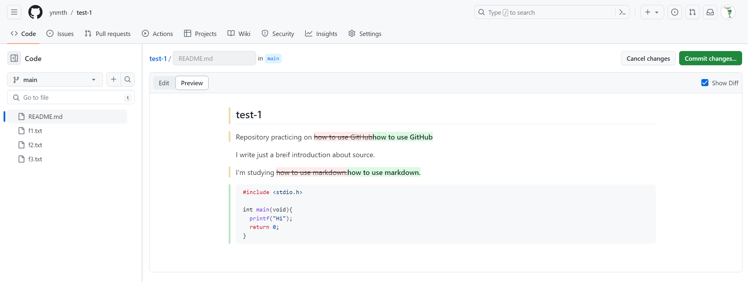 2. 수정한 후 [Preview]를 클릭해서 결과를 확인합니다. 수정하기 저의 파일 내용과 비교하고 싶다면 화면 오른쪽 위에 있는 'Show diff'에 체크합니다. 초록색 부분은 추가된 내용이고, 빨간색 부분은 삭제된 내용입니다.