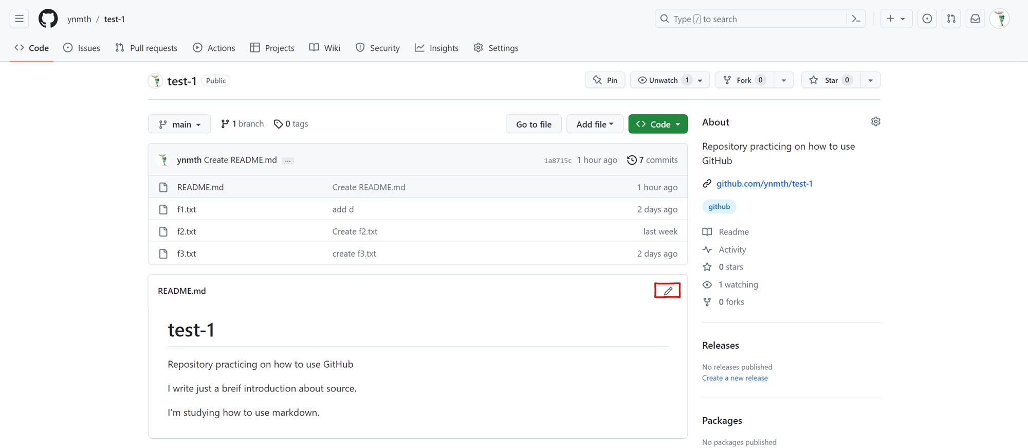 1. README 내용 오른쪽 위에 있는 연필모양 아이콘을 클릭합니다.
