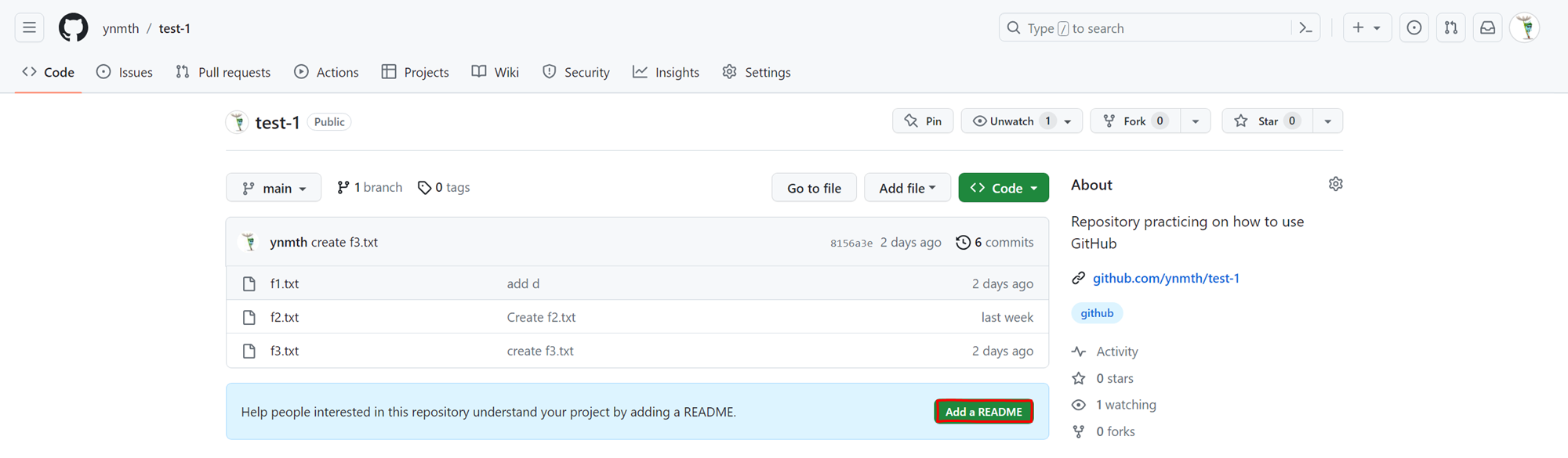 1. README 파일을 만들 깃허브의 저장소로 접속합니다. 파일 목록 아래에 있는 [Add a README]를 클릭하면 README 새 파일을 만들 수 있습니다.