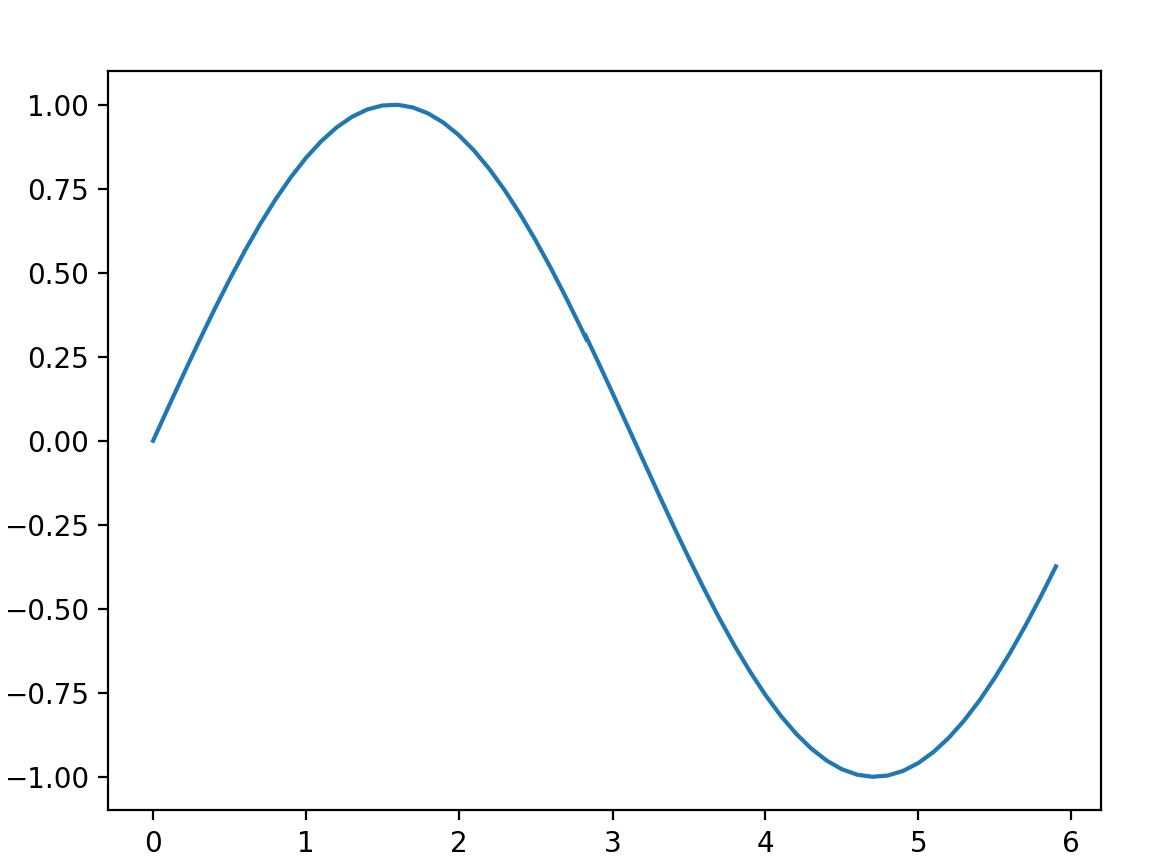 이 코드에서는 넘파이 arange 메서드로 [0, 0.1, 0.2 ,..., 5.8, 5.9] 라는 데이터를 생성하여 변수 x에 할당했습니다. 그다음 줄에서는 x의 각 원소에 넘파이의 sin 함수인 np.sin()을 적용하여 변수 y에 할당합니다. 이제 x와 y를 인수로 plt.plot 메서드를 호출해 그래프를 그립니다. 마지막으로 plt.show()를 호출해 그래프를 화면에 출력하고 끝납니다. 코드를 실행하면 아래의 그림이 보여집니다.
