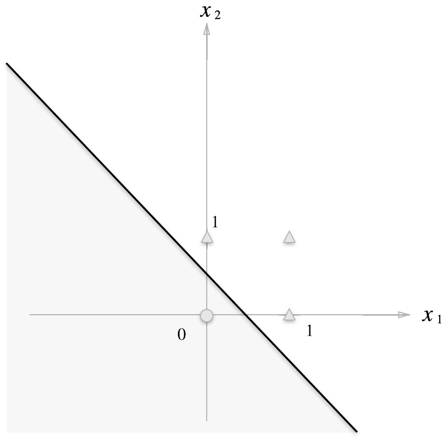 OR 게이트는 $(x_1, x_2) = (0,0)$일 때 0을 출력하고, (0,1), (1,0), (1,1) 일 때는 1을 출력합니다. 그림에서는 0을 원, 1을 삼각형으로 표시되어 있습니다. OR 게이트를 만들려면 원과 삼각형을 직선으로 나눠야 합니다.