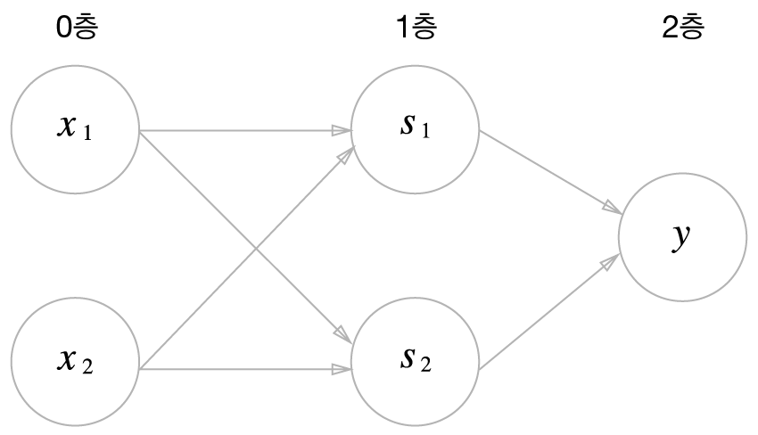 2. 1층의 뉴런이 2층의 뉴런으로 신호를 보내고, 2층의 뉴런은 $y$를 출력합니다.